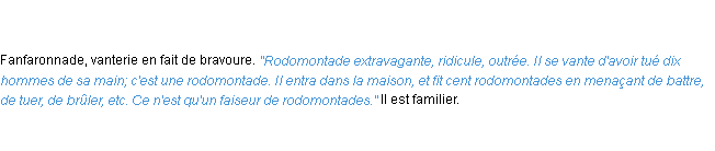 Définition du mot « rodomontade » par l’équipe de la-definition.fr (édition de 2011).Merci à Edmond et Océane pour la numérisation du mot rodomontade.