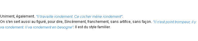 Ancienne signification parue en 17962 dans dictionnaire de l’Académie Française.Merci à Lydie et Brice pour la numérisation du mot rondement.