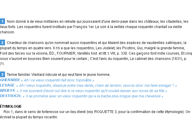 Signification développée en 1876 par Mr Littré (dictionnaire dit d’Emile Littré).Merci à Théodore et Colombain pour la numérisation du mot roquentin.