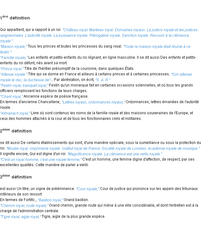 Définition du mot « royal » par l’équipe de la-definition.fr (édition de 2011).Merci à Paulette et Pierre pour la numérisation du mot royal.