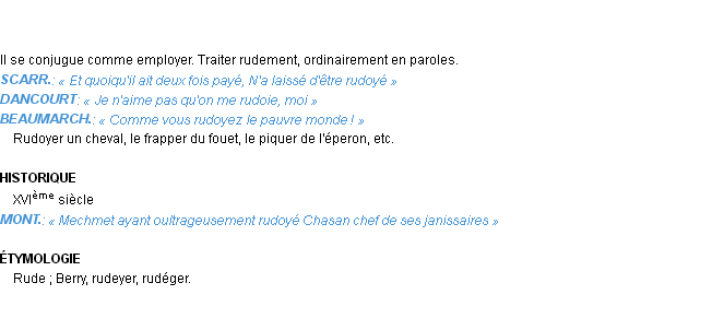 Définition développée dans dictionnaire d’Emile Littré (ancienne édition de 1876).Merci à Sylvain et Hercule pour la numérisation du mot rudoyer.