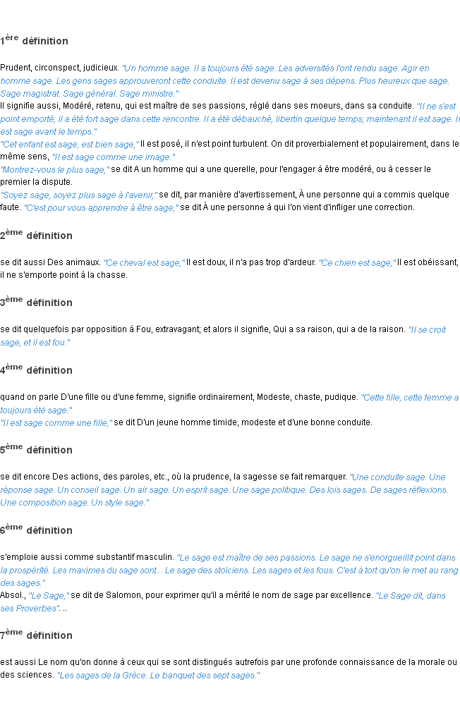 Signification parue en 2009 (source la-definition.fr).Merci à Nathalie et Stéphane pour la numérisation du mot sage.