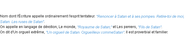 Signification parue en 2009 (source la-definition.fr).Merci à Gervais et Pascale pour la numérisation du mot satan.
