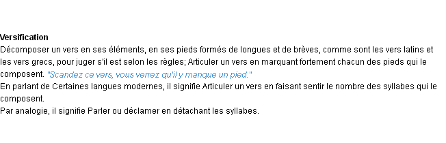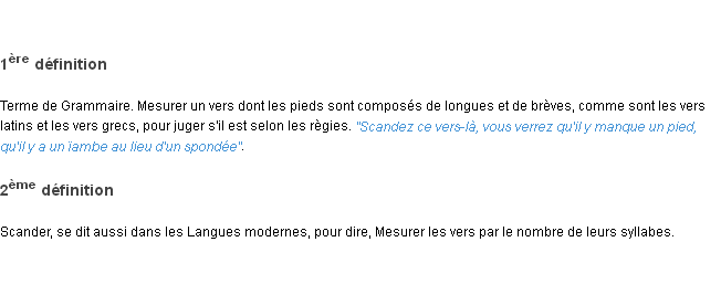 Signification du terme « scander », parution de 1876 (dictionnaire le Littré).Merci à Marguerite et Paschal pour la numérisation du mot scander.