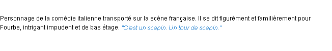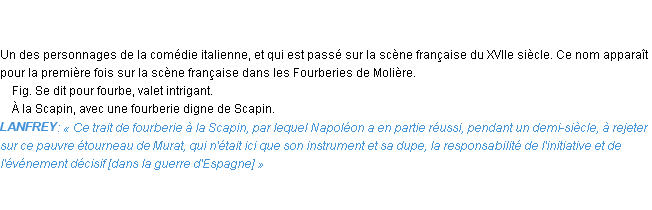 Signification développée en 1876 par Mr Littré (dictionnaire dit d’Emile Littré).Merci à Clémence et Sylvain pour la numérisation du mot scapin.