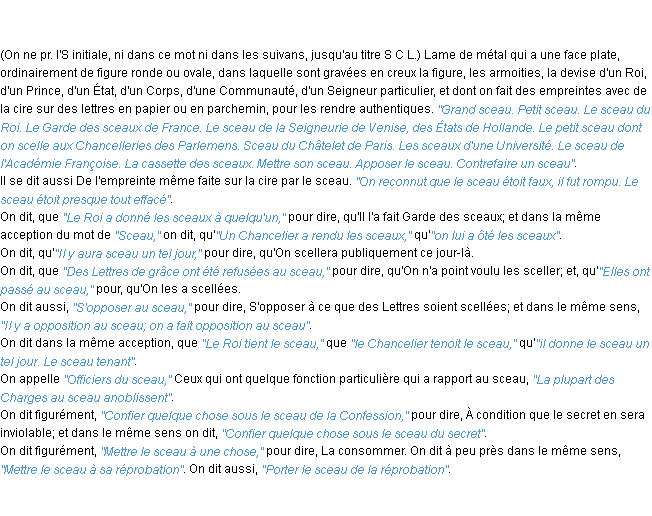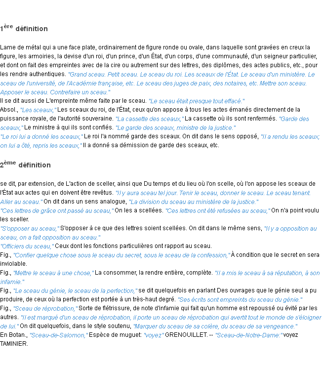 Définition de l’équipe de la-definition.fr (édition de 2009) pour le mot « sceau ».Merci à émilie et Héloïse pour la numérisation du mot sceau.
