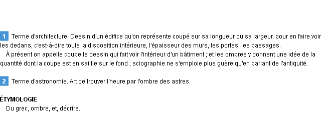 Ancienne signification parue en 17962 dans dictionnaire de l’Académie Française.Merci à Noémie et Béatrice pour la numérisation du mot sciographie.