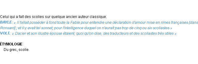 Définition d’Emile Littré (édition de 1876) pour le mot « scoliaste ».Merci à Josette et Perrine pour la numérisation du mot scoliaste.