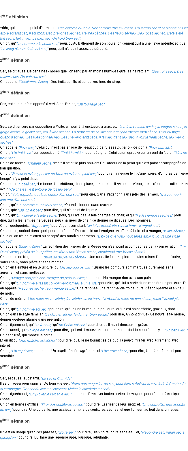 Définition issue du dictionnaire wiktionary pour le mot « sec ».Merci à Baptiste et Adrien pour la numérisation du mot sec.