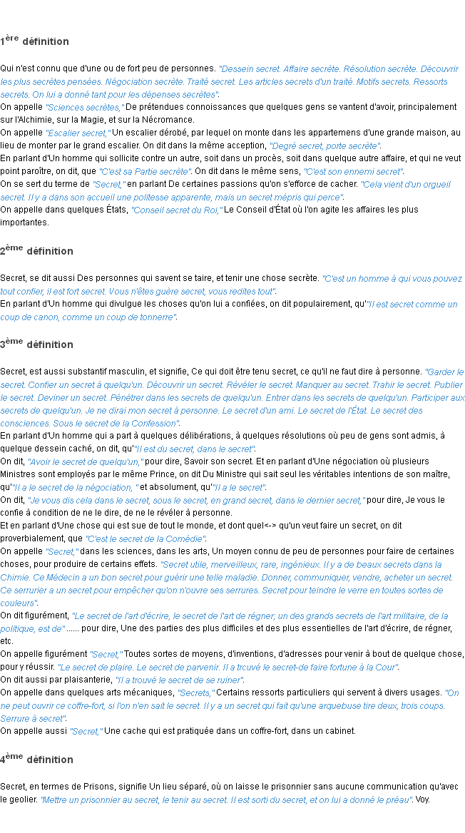 Définition de l’équipe de la-definition.fr (édition de 2009) pour le mot « secret ».Merci à Arienne et Virginie pour la numérisation du mot secret.