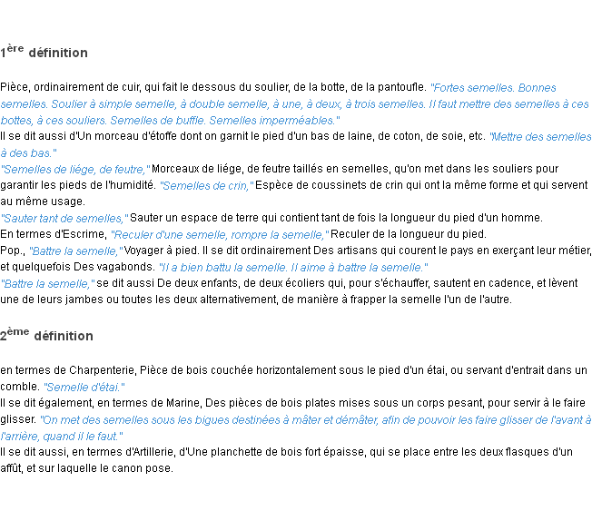Signification éditée en 2010 par l’équipe de la-definition.fr.Merci à Bastien et Pierre pour la numérisation du mot semelle.