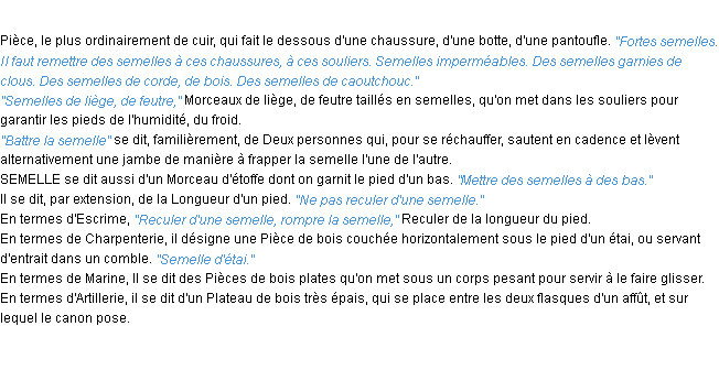 Ancienne définition de l’Académie Française (édition de 1798) pour le mot « semelle ».