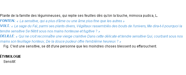 Définition développée dans dictionnaire d’Emile Littré (ancienne édition de 1876).Merci à Hugues et Adrienne pour la numérisation du mot sensitive.