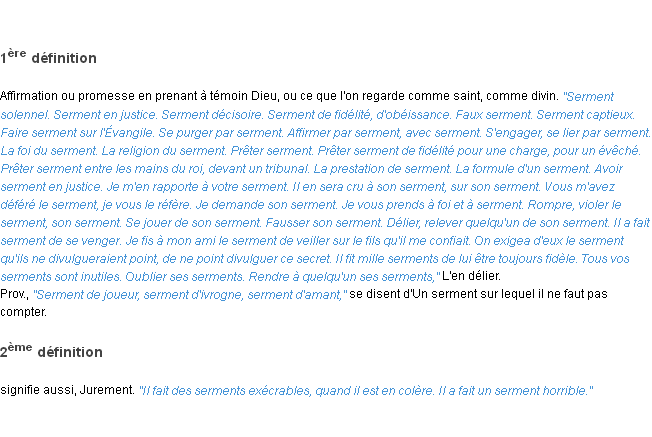 Signification éditée en 2010 par l’équipe de la-definition.fr.Merci à édouard et Basile pour la numérisation du mot serment.