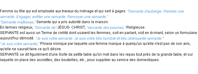 Définition de l’équipe de la-definition.fr (édition de 2009) pour le mot « servante ».Merci à Matthieu et Marc pour la numérisation du mot servante.