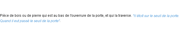 Signification éditée en 2010 par l’équipe de la-definition.fr.Merci à Arnaud et Léonard pour la numérisation du mot seuil.