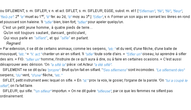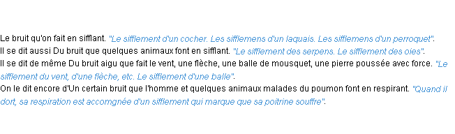 Signification développée en 1788 par Mr Féraud (dictionnaire dit « le Féraud »).Merci à Micheline et Gaston pour la numérisation du mot sifflement.