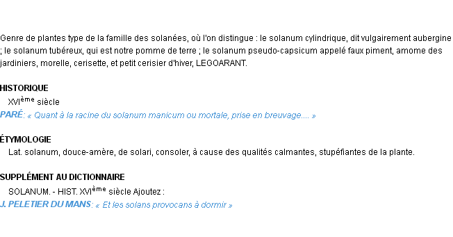 Définition du mot « solanum » par Emile Littré (édition de 1876).Merci à Nathalie et Fifi pour la numérisation du mot solanum.