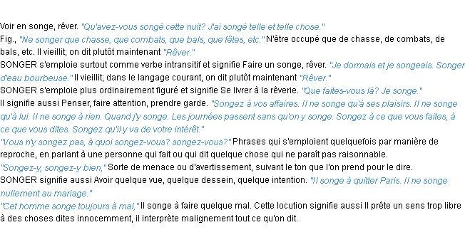 Ancienne définition de « songer » de source académique (Académie Française, parution de 1798).