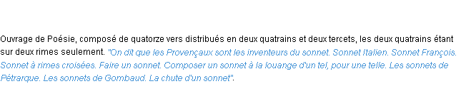 Signification éditée en 2010 par l’équipe de la-definition.fr.Merci à Geneviève et Philibert pour la numérisation du mot sonnet.