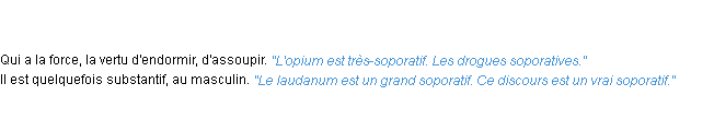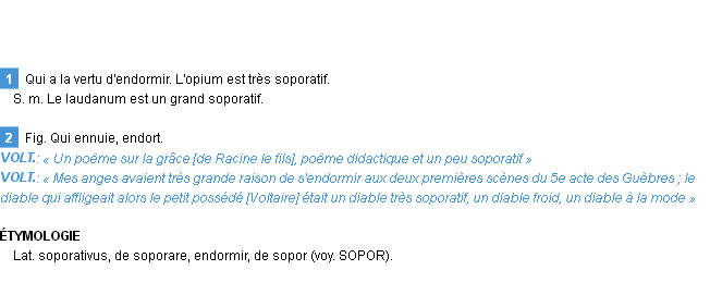 Définition du mot « soporatif » par Emile Littré (édition de 1876).Merci à Luc et Alain pour la numérisation du mot soporatif.