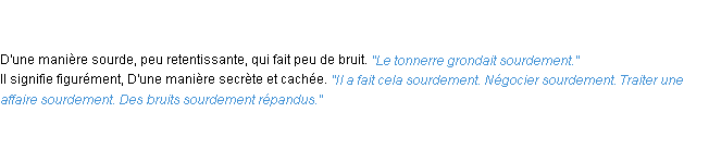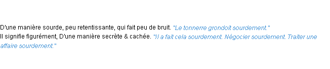 Ancienne signification parue en 17962 dans dictionnaire de l’Académie Française.Merci à Pascaline et Philibert pour la numérisation du mot sourdement.