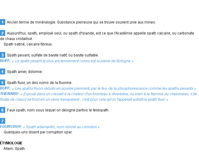 Définition de « spath » issue du Littré (Auteur Emile Littré, édité en 1876).Merci à Emmanuelle et Lydie pour la numérisation du mot spath.