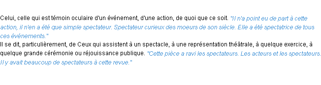 Signification éditée en 2010 par l’équipe de la-definition.fr.Merci à Fiacre et Solange pour la numérisation du mot spectateur.