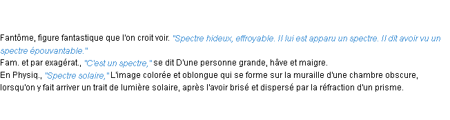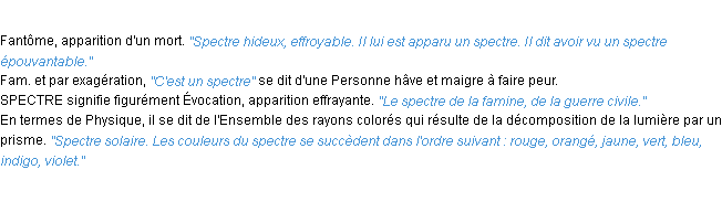 Signification éditée en 2010 par l’équipe de la-definition.fr.Merci à Aurèle et Edgard pour la numérisation du mot spectre.