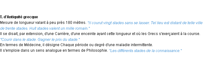 Signification parue en 2009 (source la-definition.fr).Merci à éliane et Germaine pour la numérisation du mot stade.