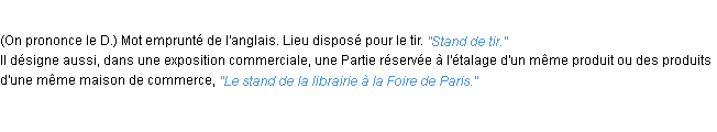 Définition issue du dictionnaire wiktionary pour le mot « stand ».Merci à Jolie et Philibert pour la numérisation du mot stand.