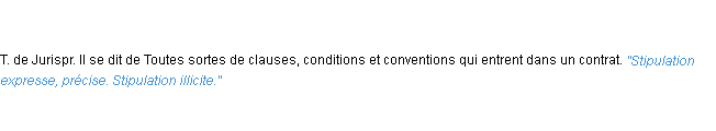 Définition du mot « stipulation » par l’équipe de la-definition.fr (édition de 2011).Merci à Micheline et Sylviane pour la numérisation du mot stipulation.