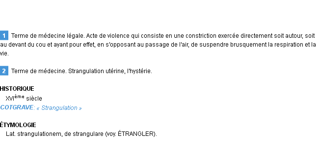 Signification du terme « strangulation », parution de 1876 (dictionnaire le Littré).Merci à Rémi et Sébastienne pour la numérisation du mot strangulation.