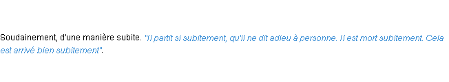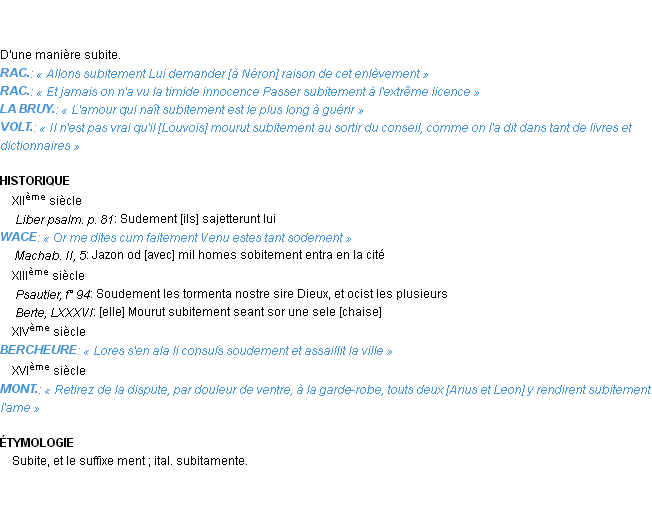 Signification développée en 1876 par Mr Littré (dictionnaire dit d’Emile Littré).Merci à Nadine et Dorothée pour la numérisation du mot subitement.