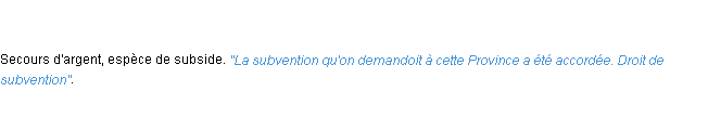 Signification éditée en 2010 par l’équipe de la-definition.fr.Merci à Theirn et Solange pour la numérisation du mot subvention.
