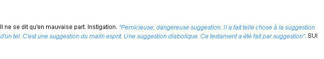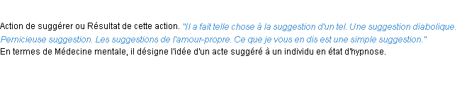 Signification éditée en 2010 par l’équipe de la-definition.fr.Merci à Renaud et François pour la numérisation du mot suggestion.