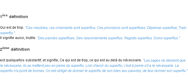 Signification parue en 2009 (source la-definition.fr).Merci à Mathilde et Lunete pour la numérisation du mot superflu.