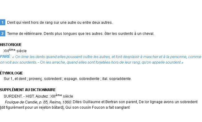Ancienne définition de « surdent » de source académique (Académie Française, parution de 1798).