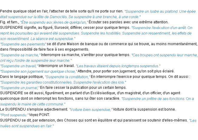 Signification parue en 2009 (source la-definition.fr).Merci à Paulette et Mathilde pour la numérisation du mot suspendre.