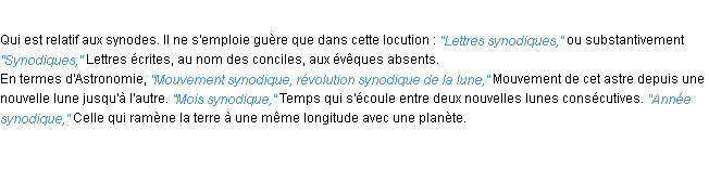 Définition développée dans dictionnaire d’Emile Littré (ancienne édition de 1876).Merci à Guillaume et Iréné pour la numérisation du mot synodique.