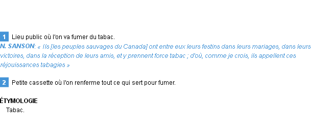 N°1 - Tabagie, terme cité par BERNARDIN DE SAINT-PIERRE au sein de son ouvrage «Harmonies de la nature : t. 2».N°2 - terme cité par Louis-Sébastien MERCIER au sein de son ouvrage «Tableau de Paris : t. 5 à 8».