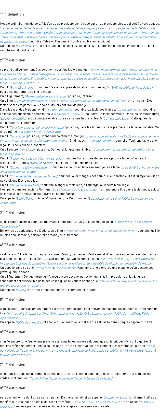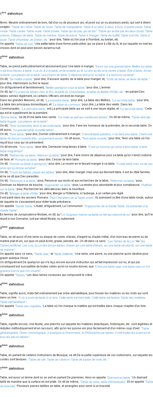 Ancienne définition du mot « table » par l’Académie Française (édition de 1835).