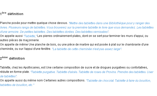 Signification parue en 2009 (source la-definition.fr).Merci à Aurèle et Germain pour la numérisation du mot tablette.