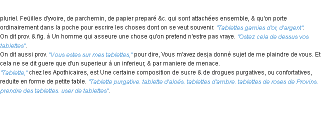 Ancienne signification parue en 1694 dans dictionnaire de l’Académie Française.Merci à Léon et Colombe pour la numérisation du mot tablettes.