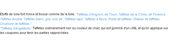 Définition du mot « taffetas » par l’équipe de la-definition.fr (édition de 2011).Merci à Joceline et Léonard pour la numérisation du mot taffetas.