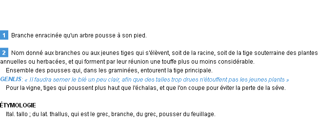 Signification développée en 1876 par Mr Littré (dictionnaire dit d’Emile Littré).Merci à Désiré et Mathilde pour la numérisation du mot talle.