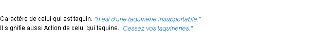 Définition du mot « taquinerie » par l’équipe de la-definition.fr (édition de 2011).Merci à Nathalie et Lucie pour la numérisation du mot taquinerie.