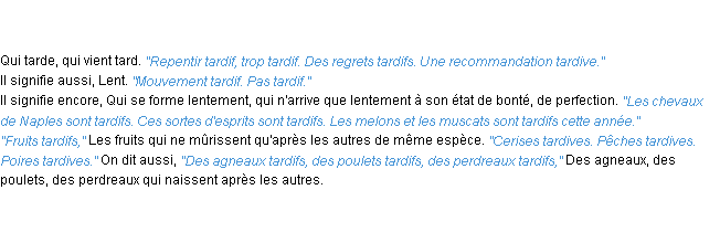 Ancienne signification éditée en 1798 pour le terme « tardif » par l’Académie Française.