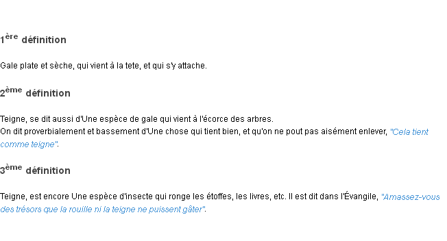 Signification parue en 2009 (source la-definition.fr).Merci à Adèle et Gaspard pour la numérisation du mot teigne.