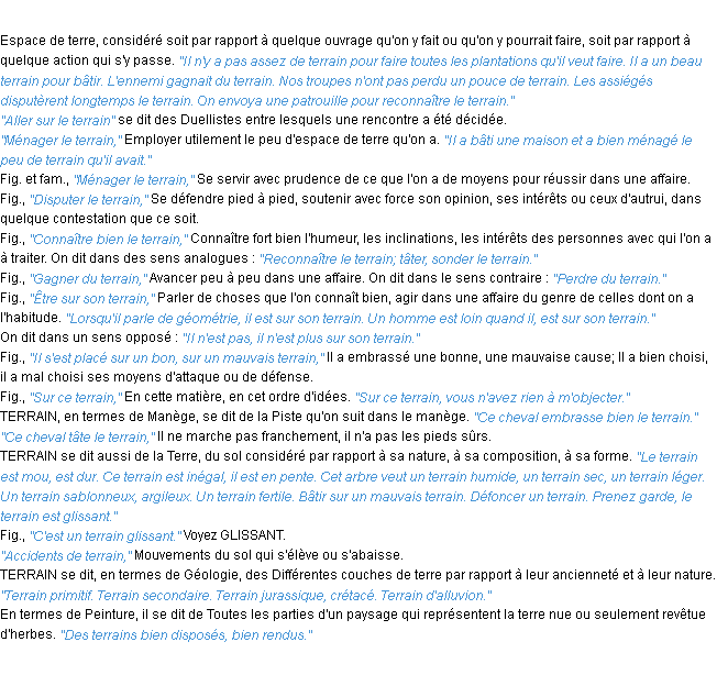Ancienne définition de l’Académie Française (édition de 1835) pour le mot « terrain ».
